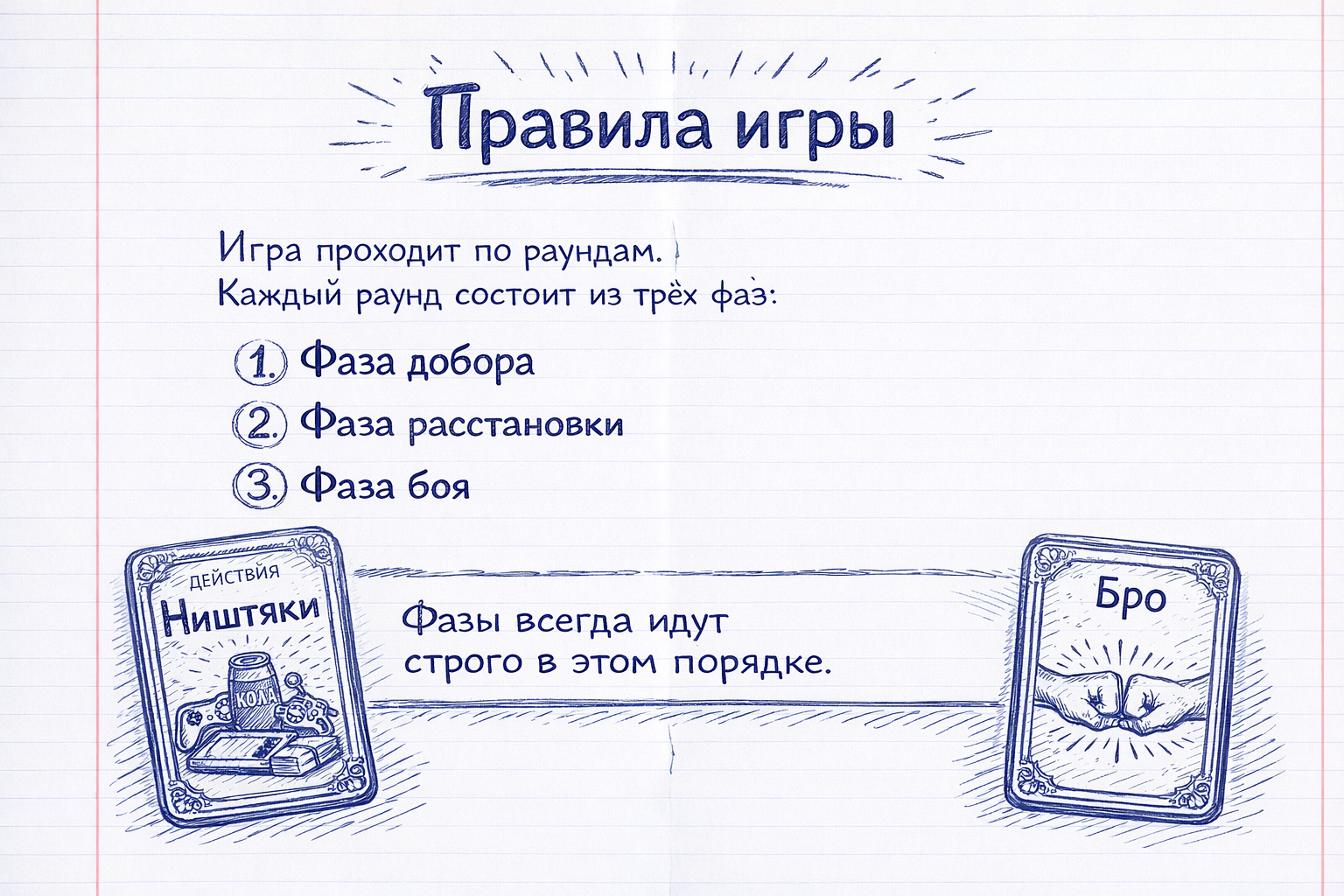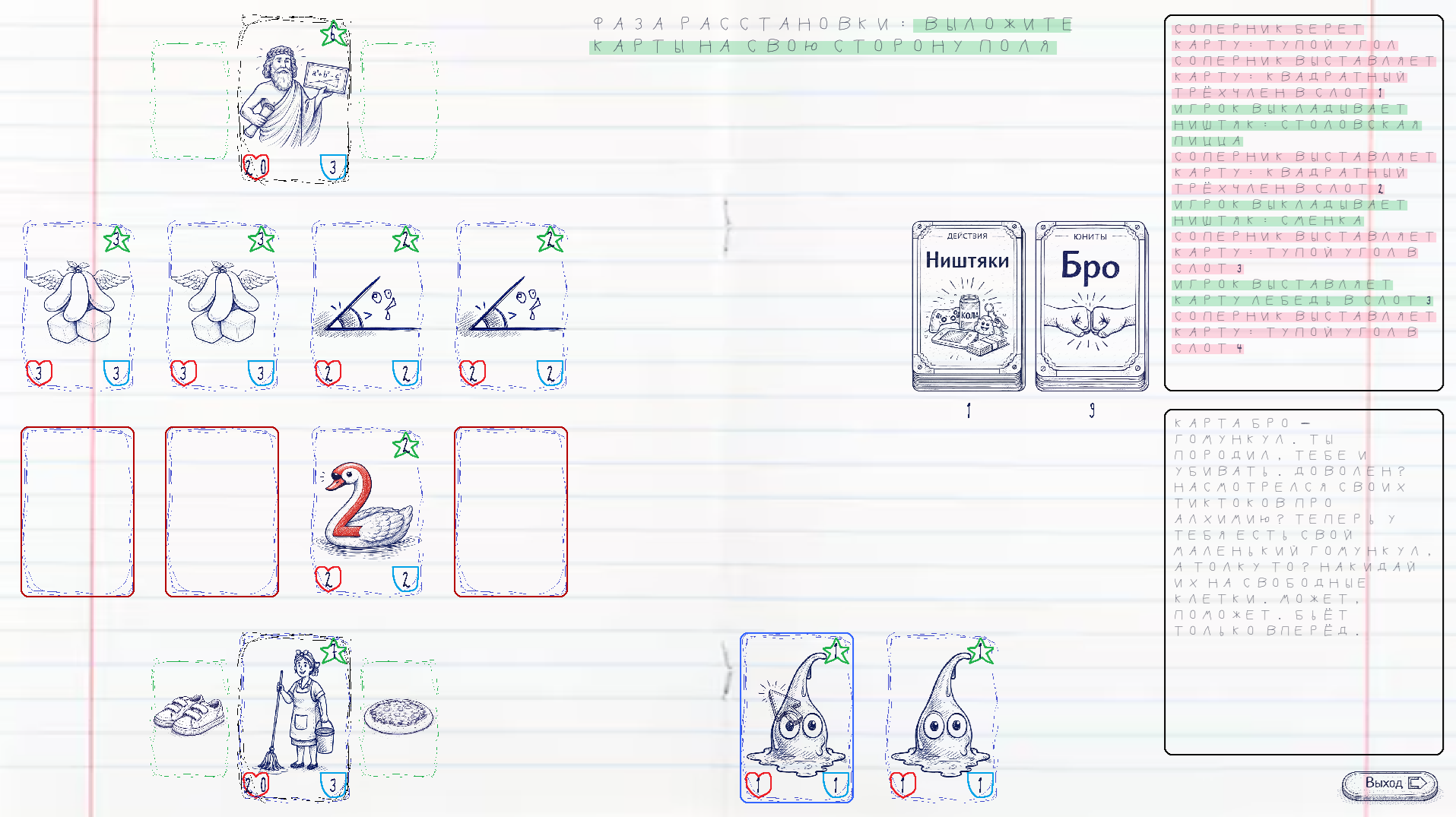 Schooly is an atmospheric card game about school showdowns, where everything is decided by cards and a bit of attitude. You build a deck of minions, place passive goodies, and fight on a board with four slots, where turn order depends on initiative.